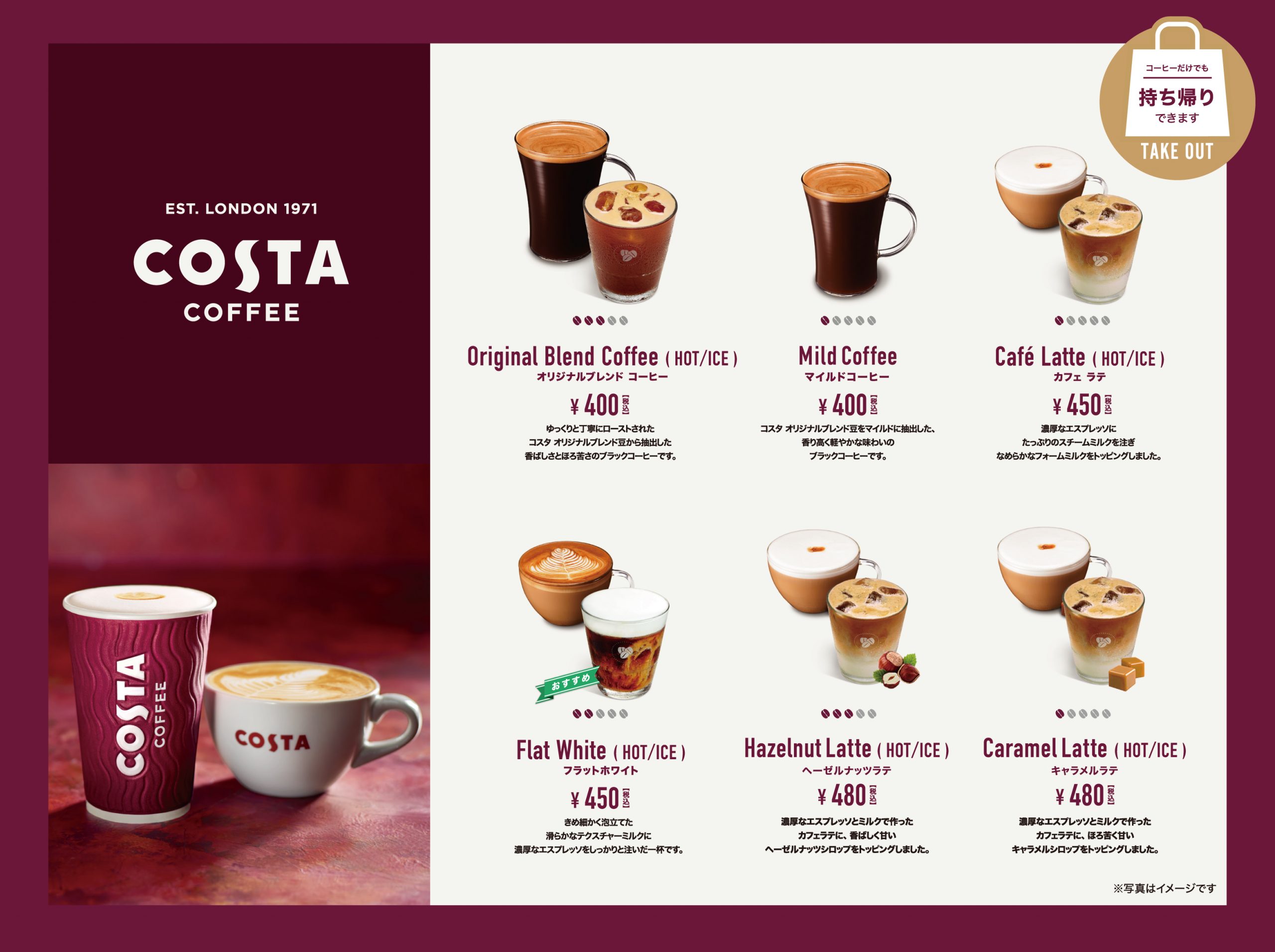 | コスタコーヒー ・オリジナルブレンドコーヒー ・マイルドコーヒー ・カフェラテ ・フラットホワイト ・アイスコーヒー ・アイスカフェラテ ・アイスフラットホワイト ・キャラメルラテ(ホット/アイス) ・ヘーゼルナッツラテ(ホット/アイス) |