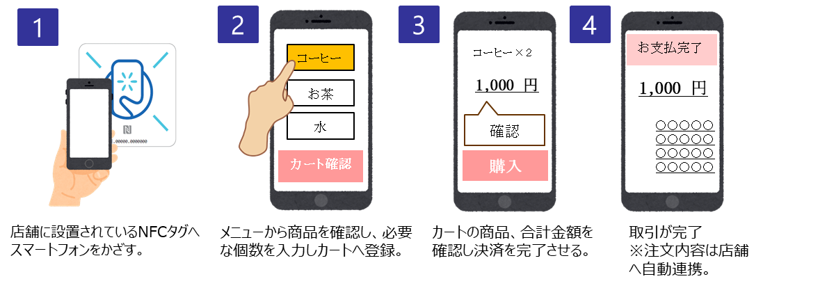※2:NFCタグを活用した新決済サービスとはNFCタグにスマートフォンをかざすことで、WEBブラウザへと遷移し、決済をオンライン上で完了させることが可能になります。ブラウザ上では、金額入力後加盟店へ決済完了画面を提示する決済方法やメニュー画面を表示す前払い式のモバイルオーダーができます。