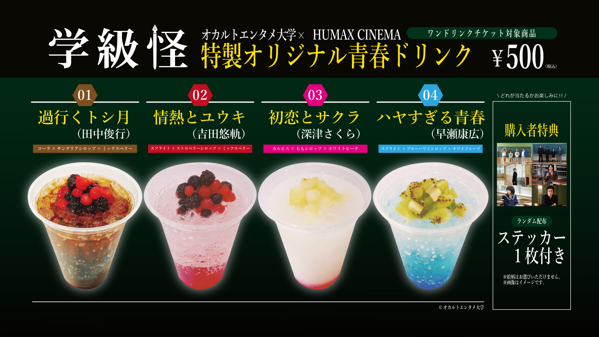 「学級怪」上映とファミリー劇場での配信を記念いたしまして、オリジナルステッカー付きドリンクを販売いたします!是非この機会にお試しくださいませ!