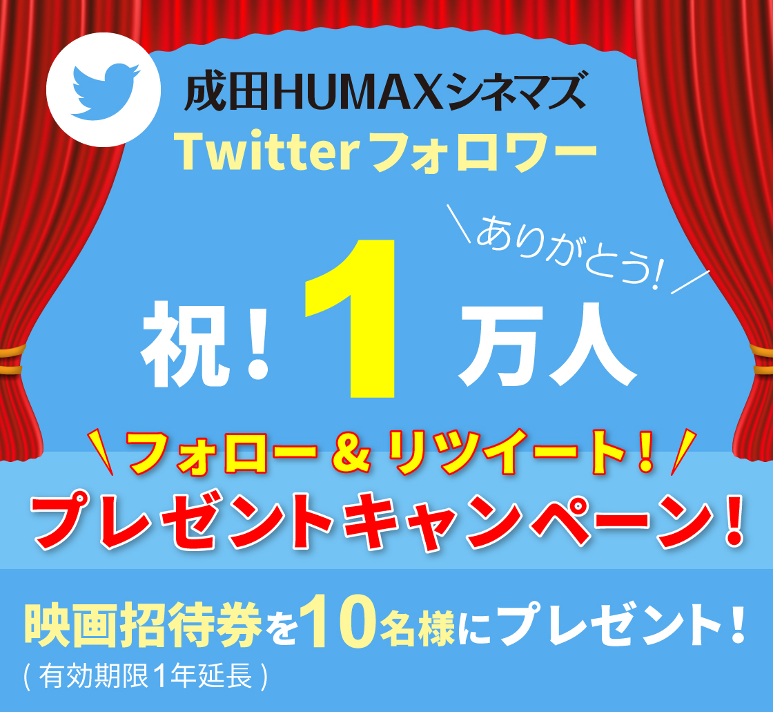 1万人突破を記念いたしまして、「いつもより有効期限が1年間長い」ヒューマックスシネマ招待券を10名様にプレゼントするフォロー&RTキャンペーンを開催いたします!