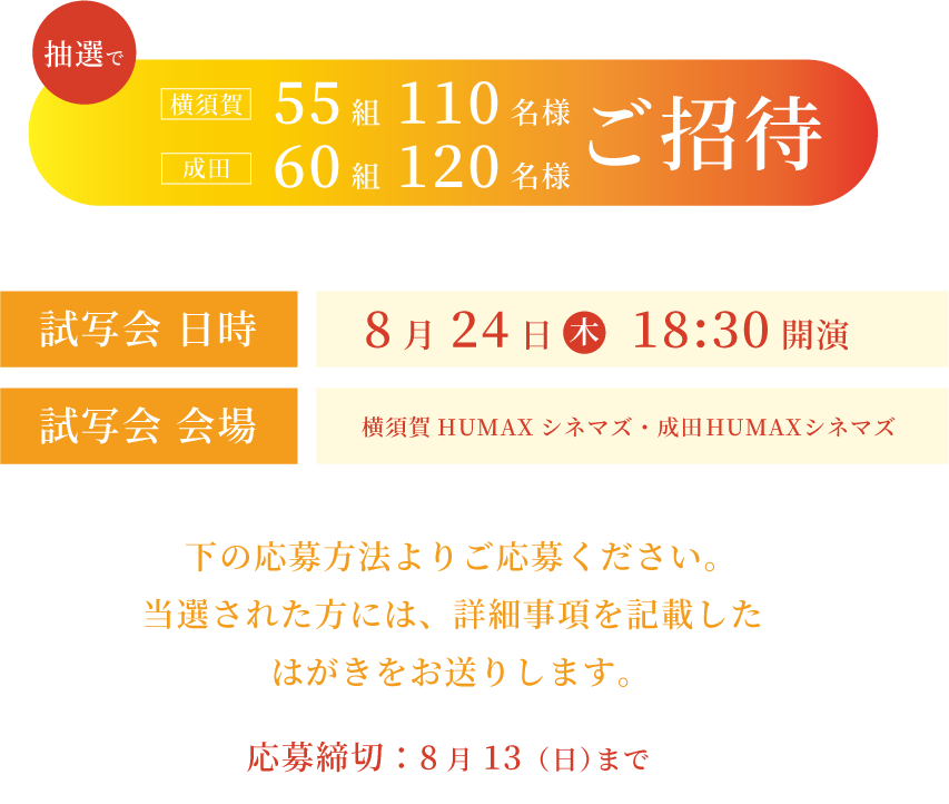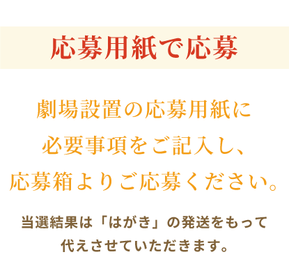・ご当選のお客様には試写のご案内をはがきでお送りいたします。住所等記載漏れ・間違いの無いようお気を付けください。