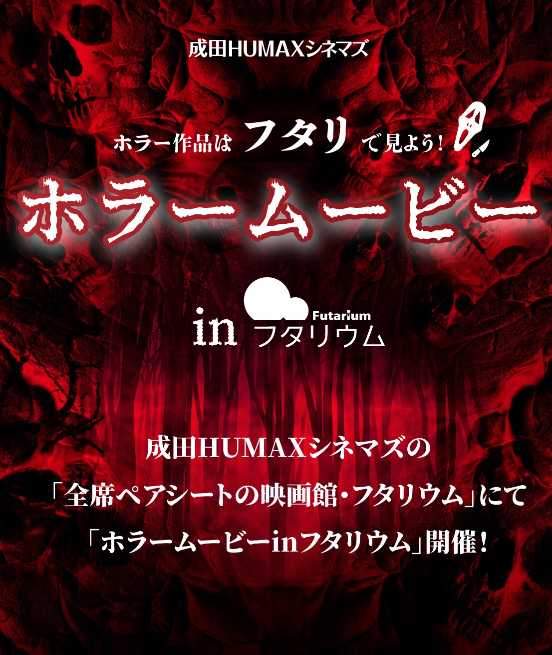 成田HUMAXシネマズの「全席ペアシートの映画館・フタリウム」にて「ホラームービーinフタリウム」開催!