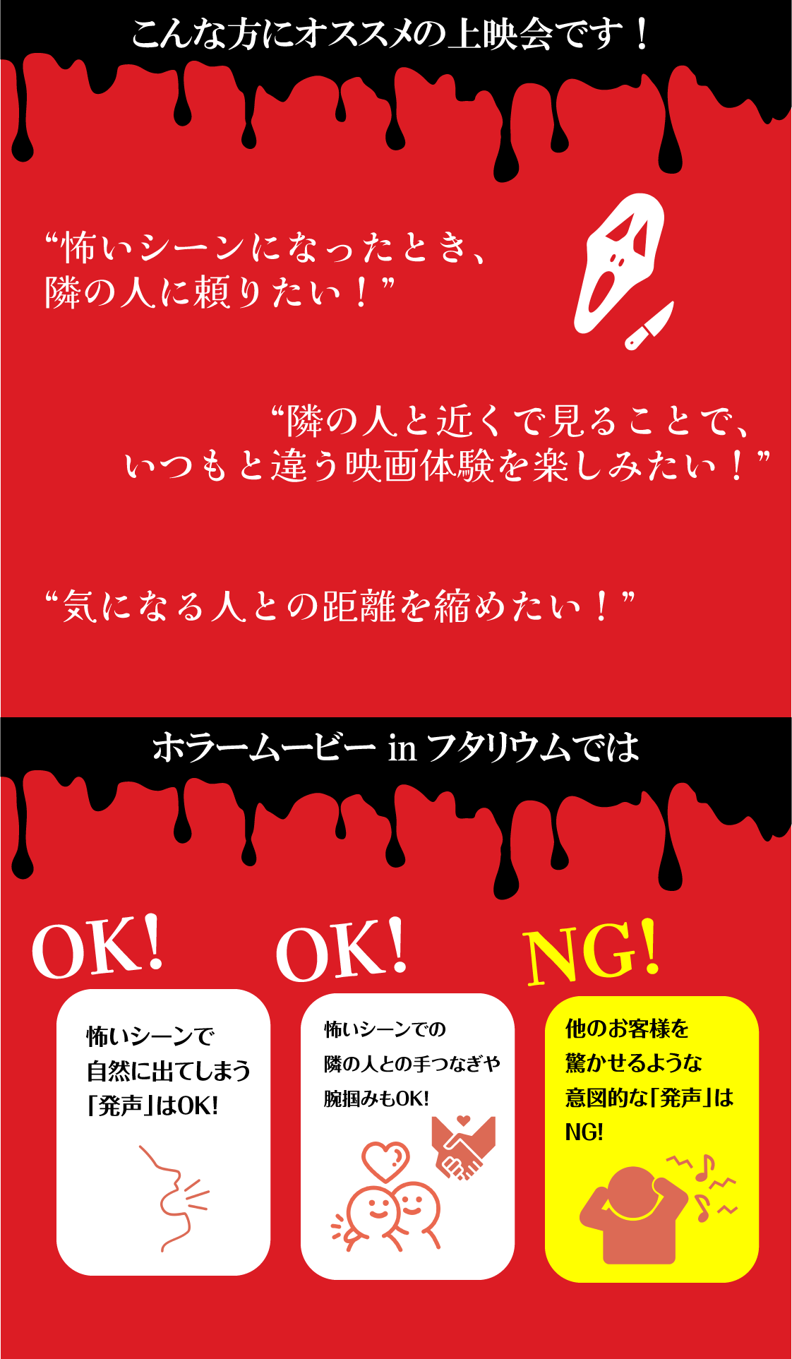 通常の上映会と異なり、一人では怖いけど誰かとならホラー映画を楽しめるかも!というお二人に向けた上映会です。