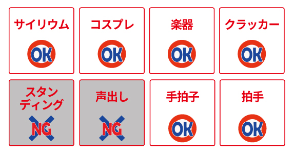 - サイリウムペンライトの持ち込み、ご使用は可能です。ただし長さ30cmを超えるもの(誘導灯や改造されて規定を超えるもの)は使用禁止とさせて頂きます。